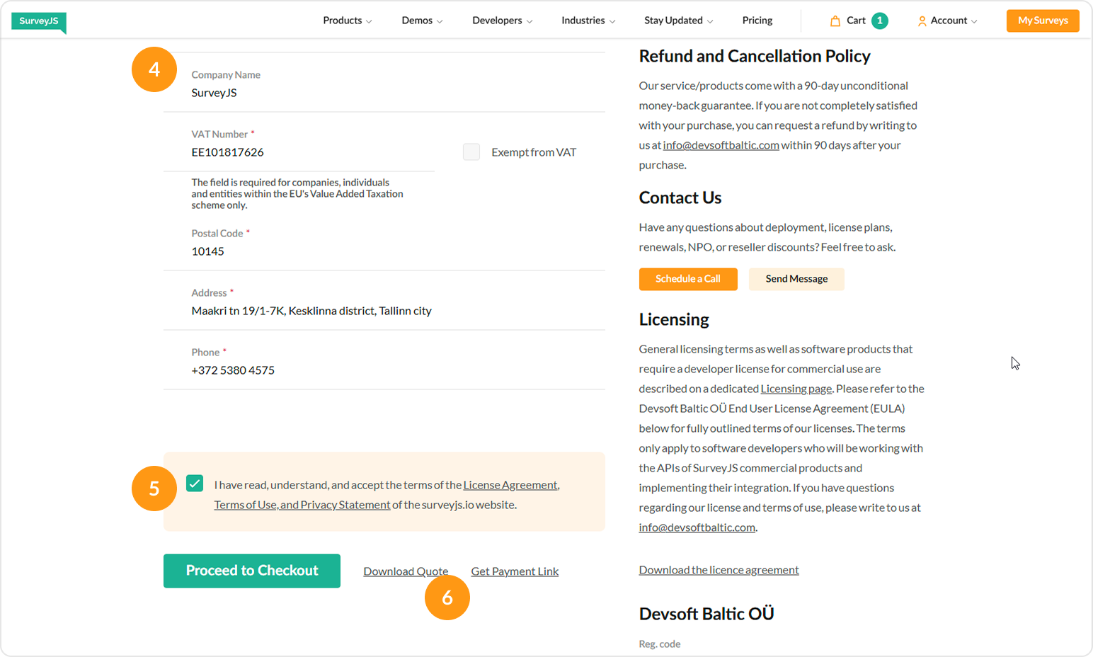 1. On the Cart page, fill in your company details and review & accept the License Agreement, Terms of Use, and Privacy Statement.